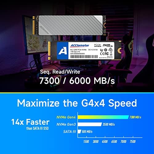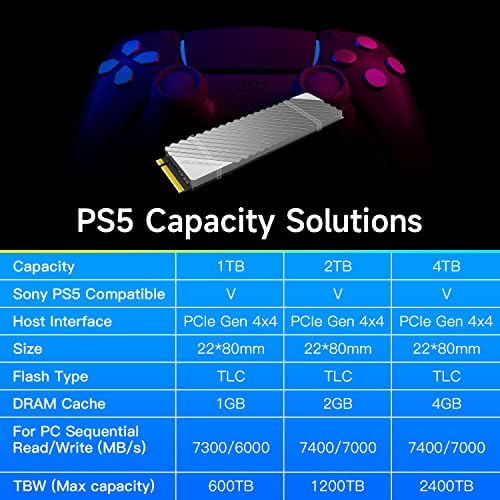 [Interface/Form Factor & Speed] PCIe 4.0 NVMe1.4/M.2 2280/3D TLC NAND,Deliver speed up to Read/Write 7300/6000MB/s,Equipped with 1GB DDR4 Cache, Transferring large files without dropping speed,Compatible with PlayStation 5 consoles (PS5 system software version 21.02-04.00.00 or higher required.)